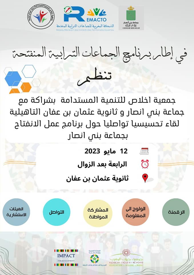 بمناسبة احتقال العالم بأسبوع الحكومة المنفتحة والذي تزامن مع الاسبوع الثاني من مايو 8- 12-2023 حيث يقوم مختلف الفاعلين من حكومات وجماعات ترابية ومجتمع مدني بتنظيم لقاءات وتظاهرات متعلقة بالحكومة المنفتحة، نظمت جمعية اخلاص للتنمية المستدامة ببني انصار وبشراكة مع جماعة بني انصار وثانوية عثمان بن عفان التأهيلية يوم الجمعة 12ماي 2023 لقاء تحسيسيا تواصليا، حضره ممثلي الجماعة، نقطة الارتكاز، اعضاء لجنة القيادة، اعضاء هيأة المساواة وتكافؤ الفرص، ممثلي جمعيات المجتمع المدني وجمعيات اباء التلاميذ، أطر ادارية وتربوية العاملة بذات المؤسسة والتلميذات والتلاميذ. افتتح السيد المدير اللقاء مرحبا بالضيوف ومشيرا الى اهمية التواصل مع التلاميذ في مثل هكذا لقاءات. وفي كلمة رئيس الجمعية الذي اشار الى انضمام جماعة بني انصار الى الشبكة المغربية للجماعات الترابية المنفتحة (REMACTO) من خلال خطة الطريق الاولى وهي الاعداد المشترك لبرنامج الانفتاح في انتظار المصادقة وإطلاق تنفيذ هذا البرنامج خلال الدورة العادية للمجلس في اكتوبر القادم واشار ايضا الى انه سيتم تنظيم لقاءات تشاورية عبر الفضاء الرقمي المخصص للإعداد المشترك لجمع اقتراحات المواطنين والمواطنات والمجتمع المدني حول الموضوع خلال الاسابيع القليلة القادمة، كما عبر رئيس الجمعية بصفته عضوا في لجنة القيادة على انخراط جمعية اخلاص للتنمية المستدامة ببني انصار بوعي ومسؤولية في برنامج الانفتاح مساهمة منها في بلورة هذا البرنامج الانفتاحي بشكل يستجيب لتطلعات المواطنات والمواطنين لبناء جماعة مواطنة تقدم خدمات دون عراقل إدارية ولا محسوبية، واضعة مصلحة المواطن فوق كل اعتبار.