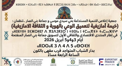 تهيب جمعية اخلاص للتنمية المستدامة بحي سيدي موسى ببني انصار بدعوة عموم المواطنين لحضور فعاليات الخيمة الامازيغية المنظمة بشراكة مع حماعة بني انصار في سياق المنتدى الاقتصادي و الثقافي لتسويق جماعة بني انصار المنفتحة ايام 3و4و5 ابريل و ذلك بملعب دار الشباب المتواجد قرب المستشفى او مقهى بالكون . حسب البرنامج التالي